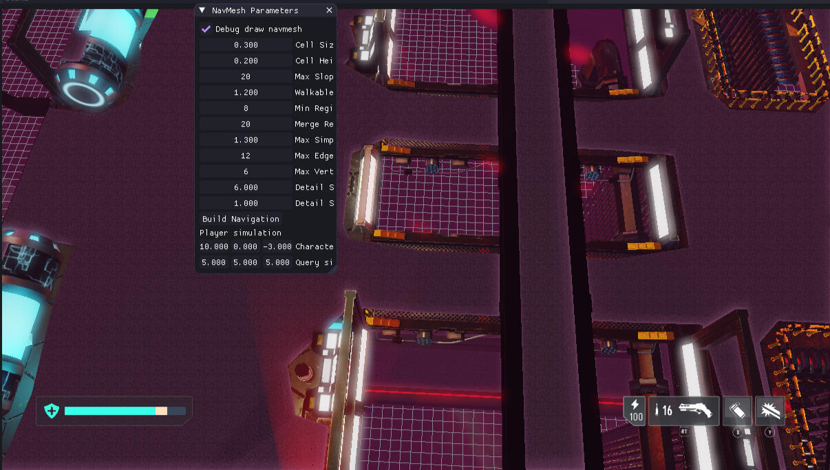 Using the Recast and Detour libraries, I implemented a system to generate a navmesh in the level, allowing the player to move without relying on the physics engine as well as creating the resource . This system also enabled intelligent and automated pathfinding for enemies. Working on this project helped me improve my ability to understand external libraries and deepened my knowledge of how pathfinding works internally.